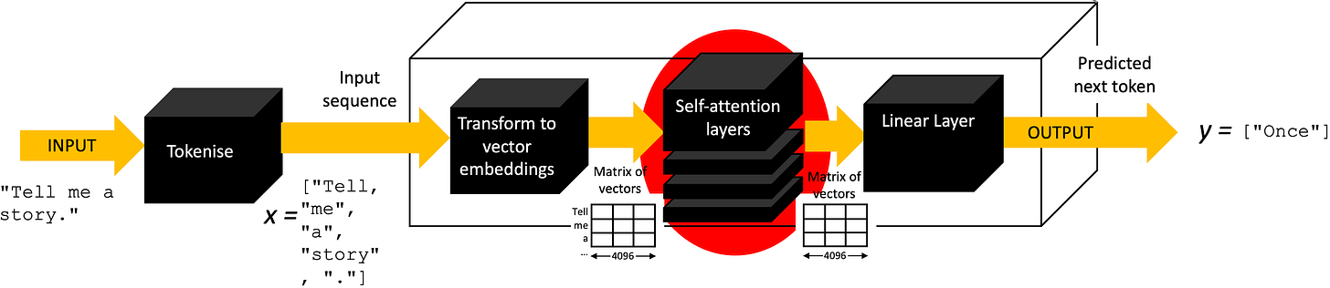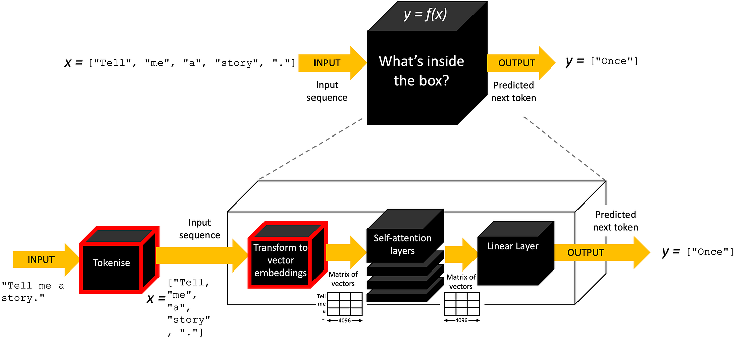As an aside, each number takes up 4 bytes, so that's 16KB for each word embedding! When I was a child in the late 80s, I had a Commodore 64, which I've recently resurrected on a Raspberry Pi. The whole free memory of my childhood computer could only have stored two of these word embeddings! That helps to put into context how modern advances in language processing are only possible because of the exponential increase in computer memory and power available to us.So we’re beginning to build a picture of how Llama works and what’s inside that black box. Here are the steps we have so far, with the ones we’ve touched on highlighted in red. We’ve turned our input into tokens and we’ve encoded each of those tokens as a vector embedding with 4096 dimensions, using some pretrained vector embeddings for our model’s vocabulary.