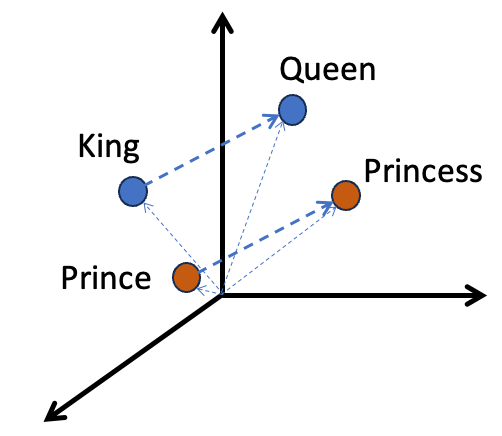 To visualise this, think of a space inhabited by words, like stars in space. The distance between words in this space is meaningful. E.g. if I make a journey from the word “king” to the word “queen”, then because of their similar relationship to each other I’d expect to make a similar journey from the word “prince” to the word “princess”.