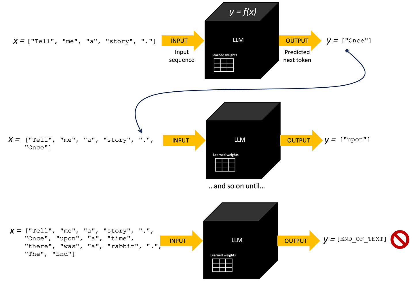 The predicted word gets added to the sequence and the process starts over again, until the LLM outputs a special “end of text” token, which signals that the text generation has finished and there’s nothing more to come. Think “over and out” on an old walkie talkie, or those situations where it’s important to know when to stop talking 🤔.