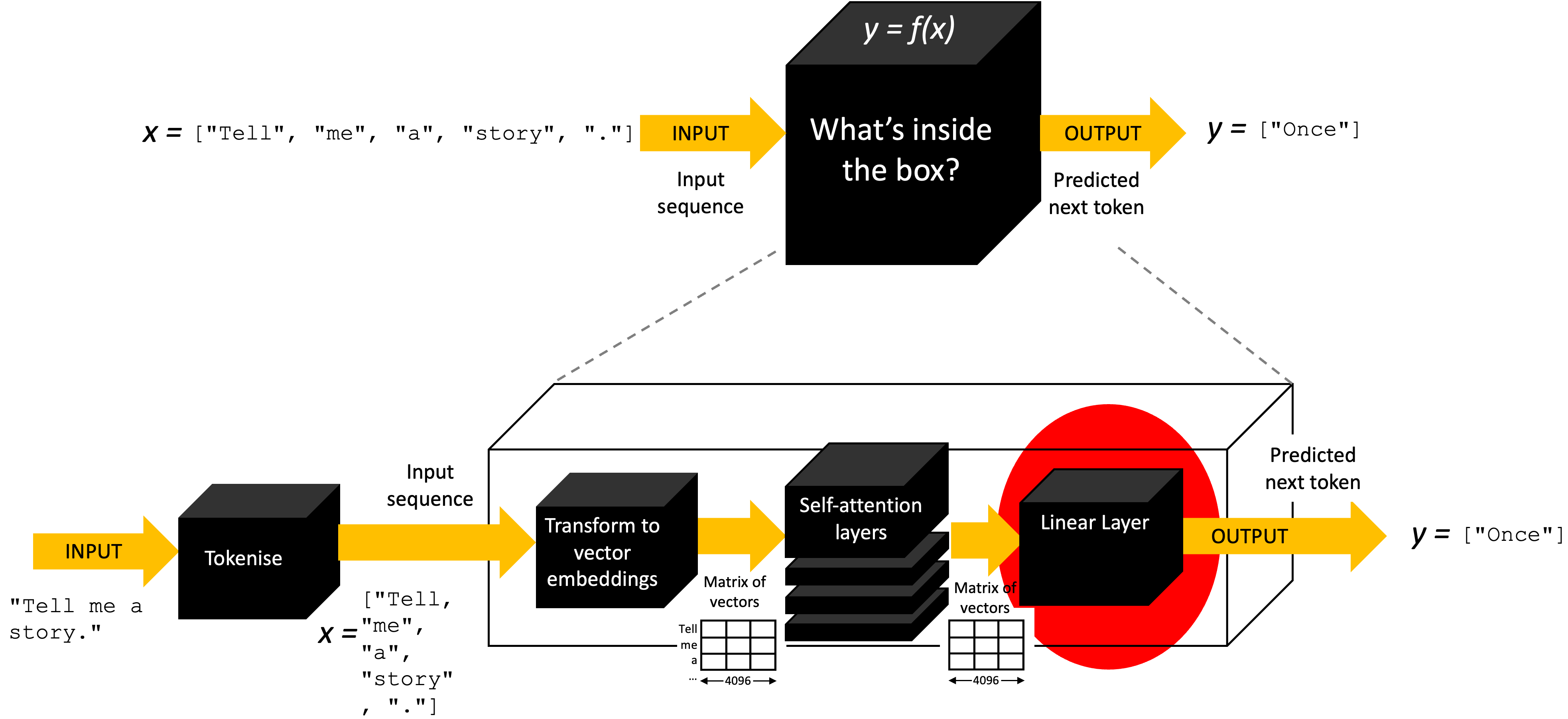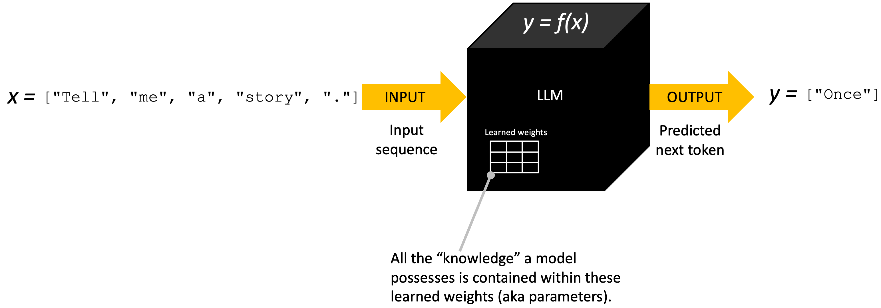 You can think of a Large Language Model as a “black box” that does one task. That task is simply to choose the most appropriate next word, based on a sequence of words fed to the model. The model repeats that simple step over and over, until it’s finished its response. The black box has just one input: a sequence of text, like a question or a prompt that we type into ChatGPT. It has just one output: the most suitable word to come next in the sequence.